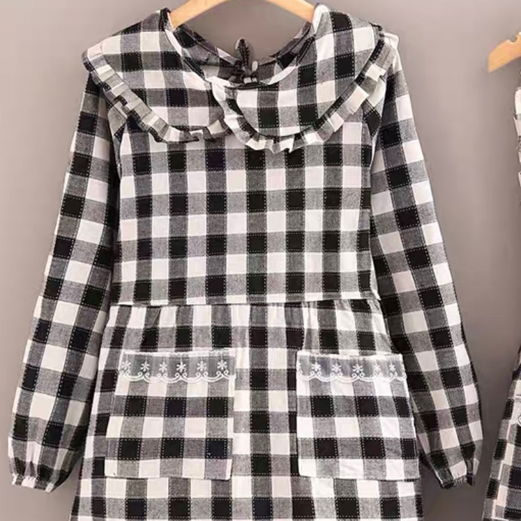 Long sleeves Apron - Ruffle Trim Black & White Checks