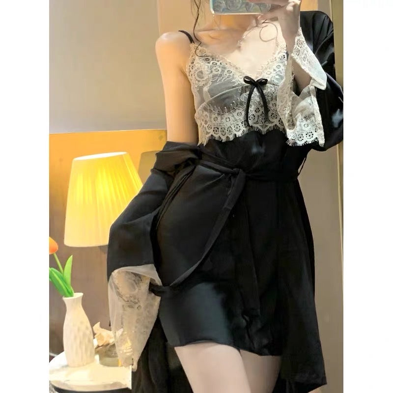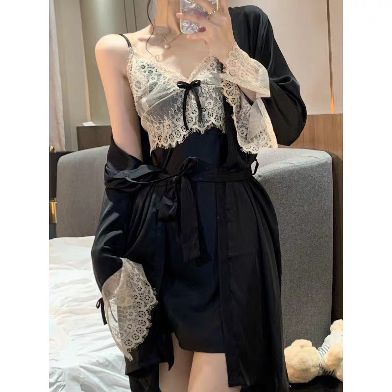 Rayon Nightie & Night Robe - Black Lace